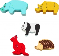 Set sadrži ručno oslikane, drvene figurice koje predstavljaju egzotične i šumske životinje, kao što su slon, panda, klokanski ili jež. Svi su elementi izrađeni od prirodnog drva i obojeni netoksičnim bojama, čime se osigurava sigurna igra čak i za najmlađe. Glatko brušeni rubovi eliminiraju rizik od iverja i oštećenja.