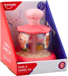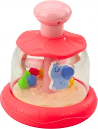Pritiskom na ružičasti gumb na vrhu vrtuljak se počinje vrtjeti, a životinje se počinju okretati oko svoje osi, stvarajući dinamični i šareni vrtuljak. Ova igračka angažira djetetov vid, sluh i pokret, potičući tako koordinaciju oko-ruka i razumijevanje uzročnosti.