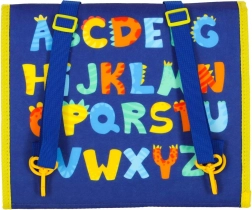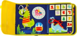- Strana 1: Filc pozadina s vježbama za finu motoriku, sat za učenje čitanja vremena, uže za stiskanje, džep s patentnim zatvaračem, cipela za učenje vezanja na čičak.