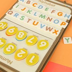 Edukativne mogućnosti: Unutar kovčega nalaze se filcane stranice za šivanje, edukativne kartice s slovima i brojevima, i brisiva ploča za kreativne aktivnosti.