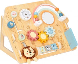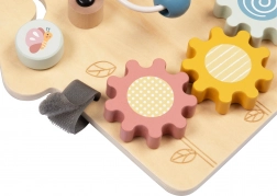 Zupčanici, klizači, dužin luk s perlicama, zrcalce i okretni valjak održavaju pažnju te razvijaju finu motoriku i koordinaciju.