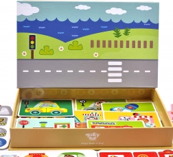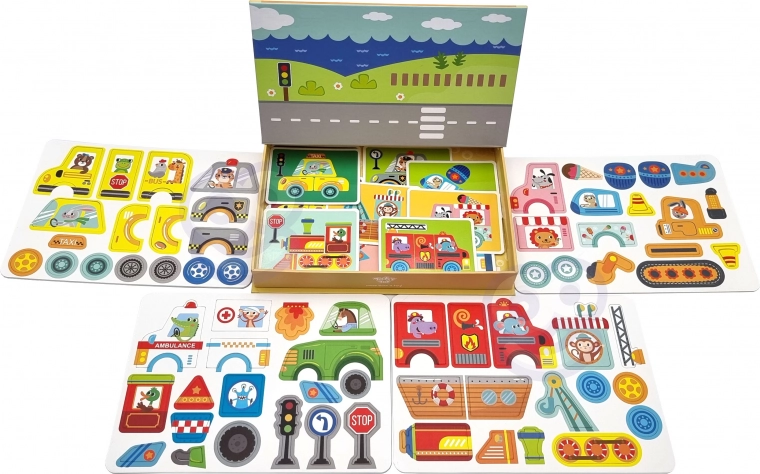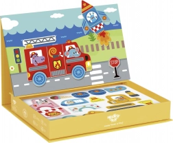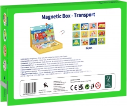 Ova magnetička slagalica u pametnoj kutiji skriva izvlačnu magnetnu ploču izravno u poklopcu. Djeca mogu pomoću šarenih magnetnih dijelova slagati životinje i druge motive na pripremljenim podlogama ili stvarati vlastite sličice. Igra razvija kreativnost, koncentraciju i koordinaciju ruka–oko.