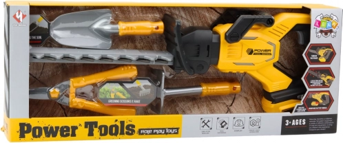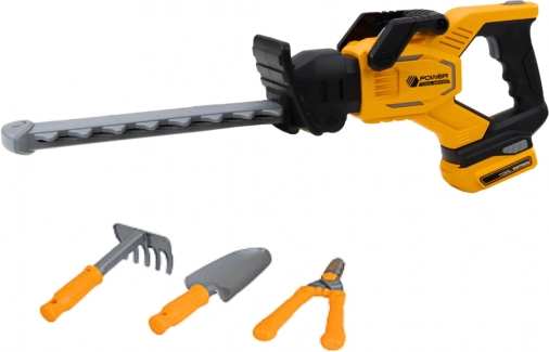 Dječji vrtni set sadrži realističnu igračku verziju električnih škara za živicu s pokretnim plastičnim oštricama. Dovoljno je pritisnuti gumb i može započeti sigurno “rezanje”! Škare imaju ergonomsku dršku, odvojivi baterijski modul i elemente koji oponašaju rad pravog vrtnog alata. Dio seta su i ručni alati: grablje, lopatica i škare za granje.