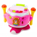Glazbeni bubanj osmišljen je kako bi spojio funkcije bubnja, edukativne igračke i karaoke seta. Nudi 8 različitih interaktivnih načina rada, koji uključuju zvukove životinja, pjesme, kvizove, ritmičke melodije i priče. Šareni dodirni panel svijetli u ritmu zvukova, što igri na bubanj daje dodatnu čar.
