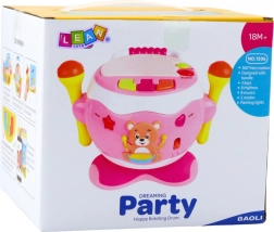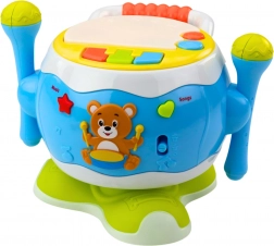 Ovaj glazbeni bubanj nudi 8 različitih načina igre: sviranje bubnja, slušanje glazbe, edukativne pjesme, priče i kvizovi. Ima šarena tipkala s slikama životinja, svjetleću dodirnu ploču, interaktivni mikrofon i dvije simpatične palice za bubanj. Sve je smješteno u stabilnoj, šarenoj konstrukciji s motivom preslatkog medvjedića.