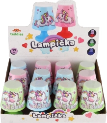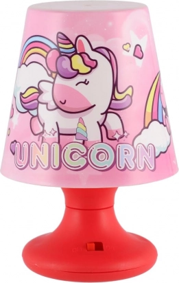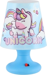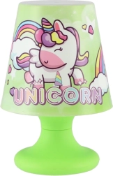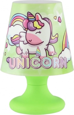 Sjenilo s natpisom „UNICORN” i stabilno postolje osiguravaju sigurno korištenje i ugodno difuzno svjetlo koje ne remeti san. Praktični klackalni prekidač na bazi omogućuje djeci da lampicu lako uključe i isključe.