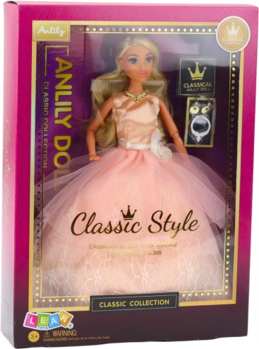 Lutka Anlily u puderastoj večernjoj haljini djeluje iznimno zahvaljujući lepezasto oblikovanoj dekorativnoj volani i ukrasnoj mašni. Ima dugu plavu kosu koju je moguće češljati i stilizirati, a njezina nježna šminka i izražene crte daju lutki topao i elegantan izgled. S pokretnim udovima – rukama, nogama i glavom – lutka je idealna za dinamičnu igru, presvlačenje i stvaranje svakodnevnih i bajkovitih priča.
