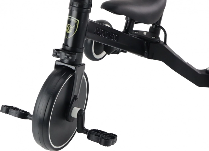 Model PRO50 opremljen je praktičnom ručkom za vođenje, koja se lako može demontirati kada dijete počne voziti samostalno. Konstrukcija omogućuje vožnju s razdvojenim ili spojenim stražnjim kotačima, što povećava stabilnost na početku učenja i omogućuje postupan prijelaz na tradicionalniji oblik bicikla.