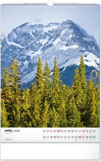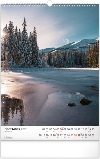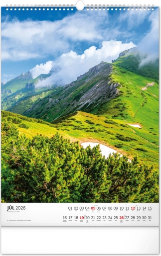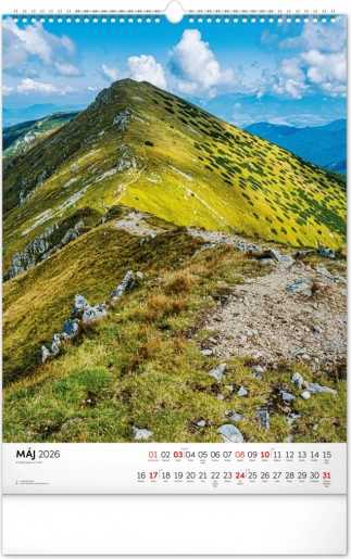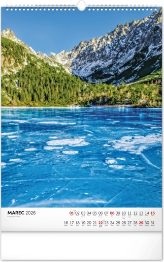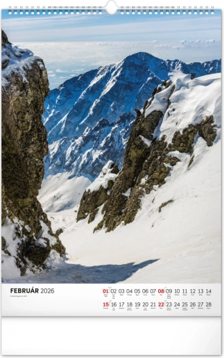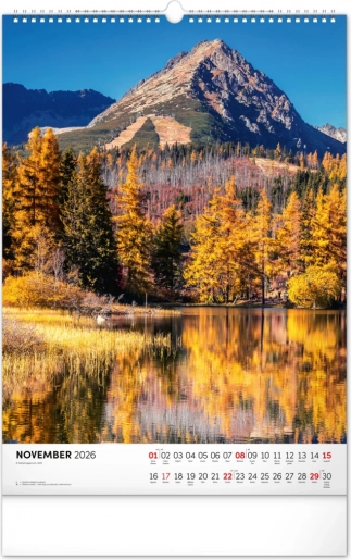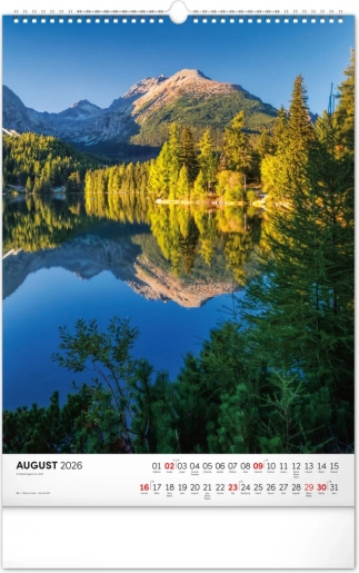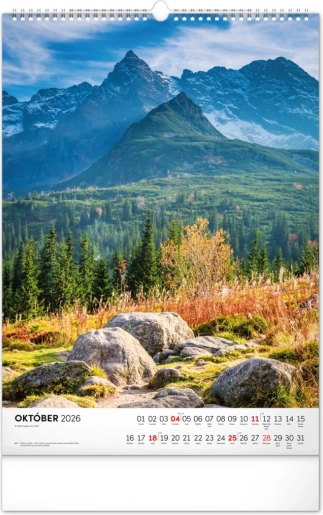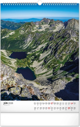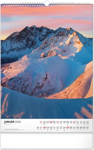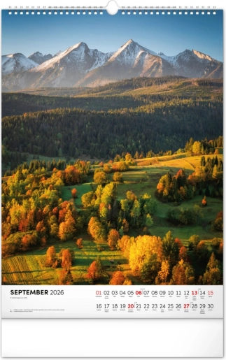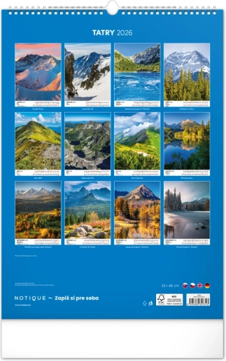 Zidni kalendar Tatre 2026 sa snimkama planinskog krajolika, format 33 x 46 cm, slovenski kalendar, opisi na 4 jezika.