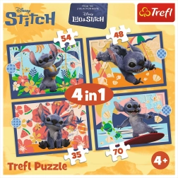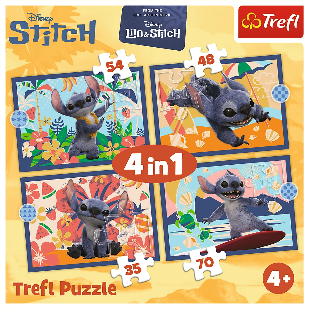 Ovaj set sadrži 4 neovisne puzzle s motivom odmora na Havajima iz omiljenog filma Lilo & Stitch. Nakon slaganja nastaju slike dimenzija 285 × 205 mm, idealne za udobno slaganje na stolu ili podlozi. Zahvaljujući različitom broju dijelova djeca mogu birati prema raspoloženju i postupno razvijati svoje vještine.