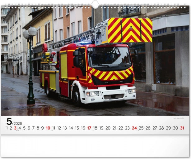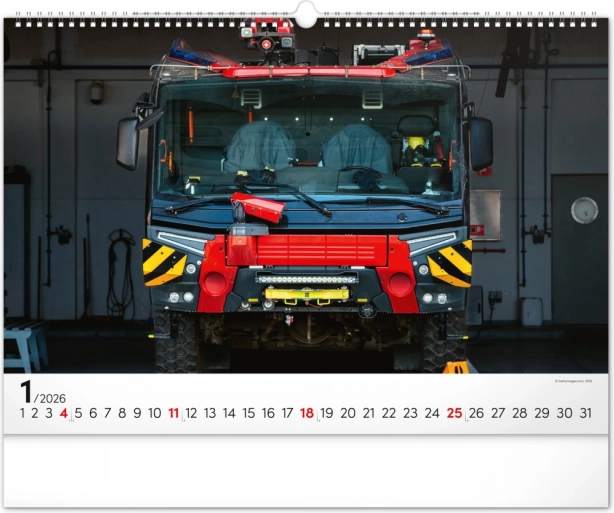 Svaki mjesec kalendara prikazuje jedinstvene fotografije vatrogasnih vozila koje oduševljavaju dinamikom i vatrenom atmosferom. Kalendar ima univerzalno kalendarij koje je pregledno postavljeno na elegantnoj crnoj pozadini.