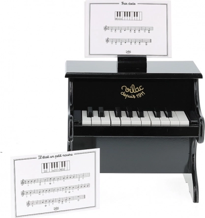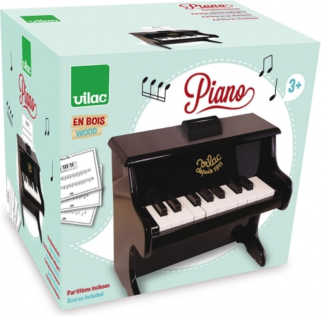 Drveni klavir VILAC lijepa je i izdržljiva igračka za prve glazbene korake. Zahvaljujući kompaktnim dimenzijama stane u dječju sobu, a njegova elegantna crna izvedba privlači na prvi pogled. Nije namijenjen kao punovrijedan glazbeni instrument, već kao kvalitetna igračka za otkrivanje svijeta tonova.