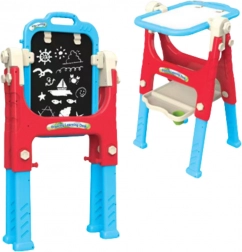 Visina i kut ploče su podesivi kako bi odgovarali visini i dobi djeteta. Set sadrži sav potreban pribor: 12 bojica, 12 šarenih kredu, 4 vodena flomastera, 10 listova formata A4 i spužvicu, zajedno s organizatorom za pribor. Stabilna baza i čvrsta stolica osiguravaju udobnost tijekom kreativne igre, jačajući manuelne vještine i prostornu maštu.