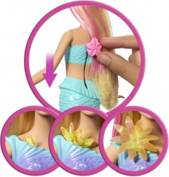 Otkrijte čaroliju igre s lutkom BARBIE morska vila, koja pomakom polugice na leđima prikazuje očaravajuće cvjetanje od korzeta do peraje. Zahvaljujući duginim cvjetovima, ombré peraji i bisernom obruču u dugoj plavoj kosi s ružičastim pramenovima, idealna je za maštovitu igru na kopnu i u vodi. Savršen dar za djecu od 3 godine.