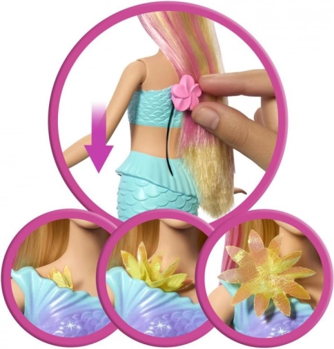 Lutka Barbie Čarobna cvjetna morska vila donosi jedinstveni vizualni efekt: jednostavnim pomakom polugice na leđima cvjetovi “procvjetaju” od korzeta do repne peraje – uvijek iznova. Djeca će obožavati bajkovite boje, fine detalje ljuskica i dodatke koji potiču maštu i pripovijedanje.