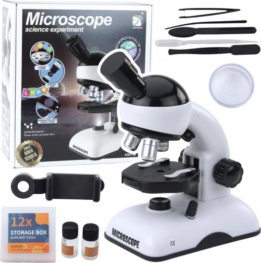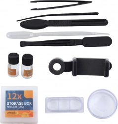 Osim toga, dio seta je i držač za telefon, koji omogućuje lako dijeljenje otkrivenih slika. Uključeni su i svi potrebni pribori za prve pokuse, uključujući pincetu, stakalca i laboratorijski alat.