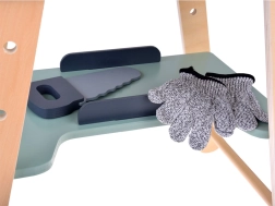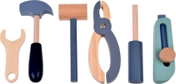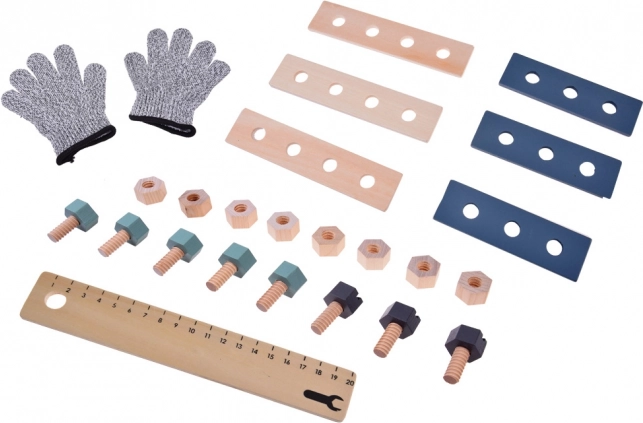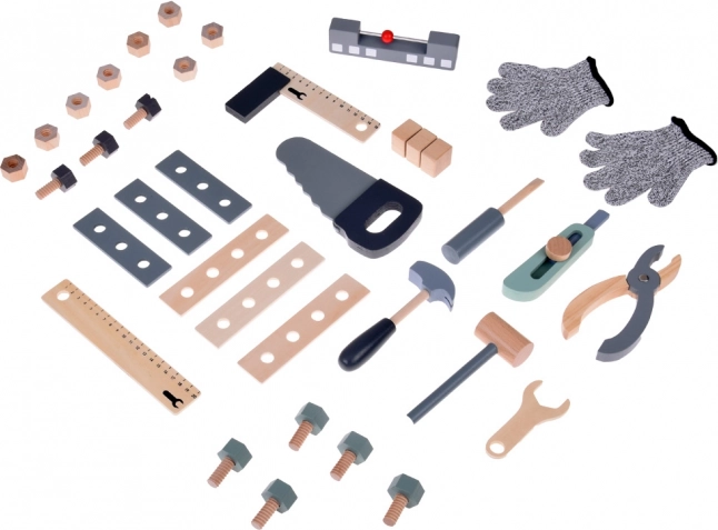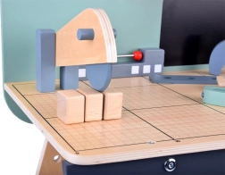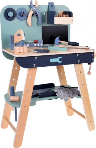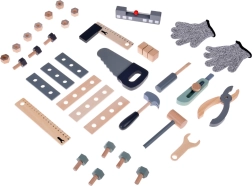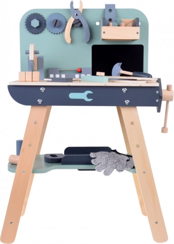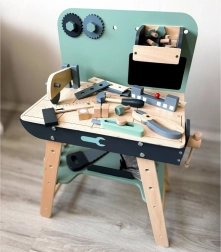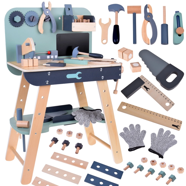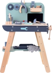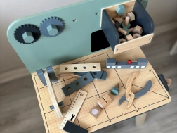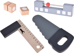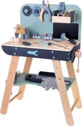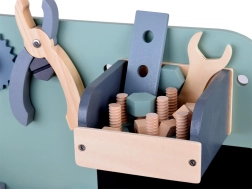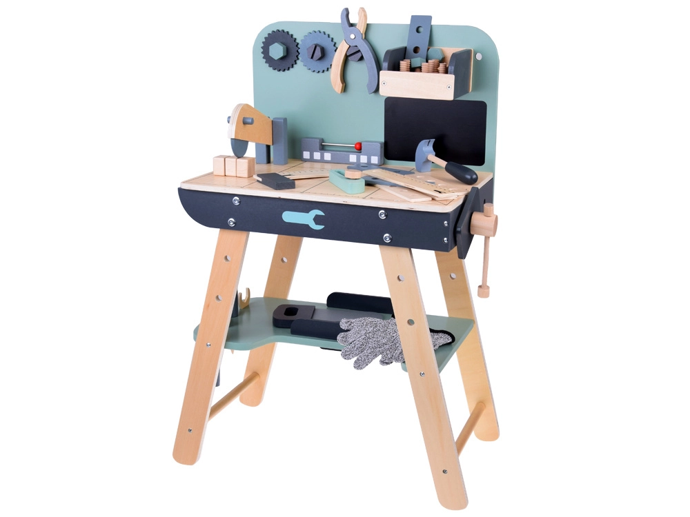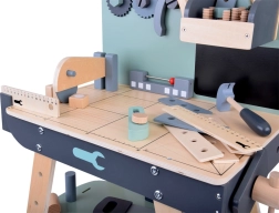 Set je izrađen od izdržljivog drva i sadrži alate poput čekića, ključeva, odvijača i drugih. Svi elementi su sigurni, zaobljeni i izrađeni s naglaskom na detalje. Radionički prostor opremljen je i manjom pločom za pisanje kredom za osmišljavanje projekata.
