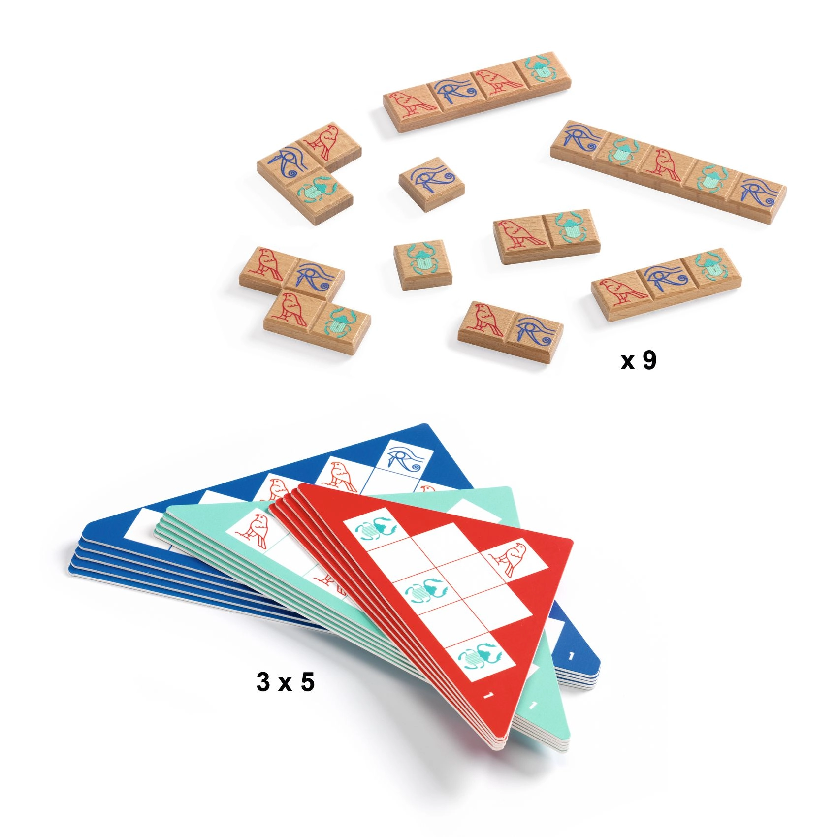 - 15 obostranih trokutastih kartica s ilustracijama, 9 drvenih pločica s hijeroglifima, pravila igre na 10 jezika