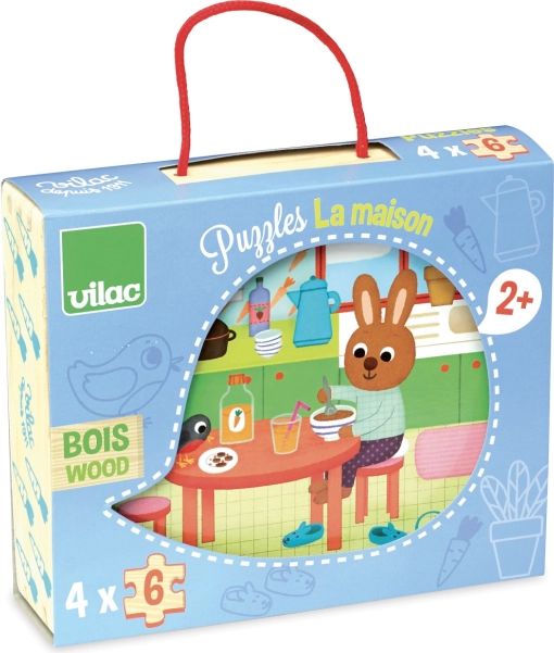 Otkrijte kvalitetne drvene puzzle VILAC s motivima domaćinstva, idealne za najmlađe od 2 godine. Pakiranje sadrži 4 zasebne puzzle po 6 dijelova u praktičnoj drvenoj kutiji s pamučnom ručkom. Sjajan izbor za razvoj fine motorike, logike i koncentracije djece.