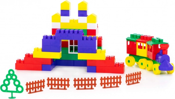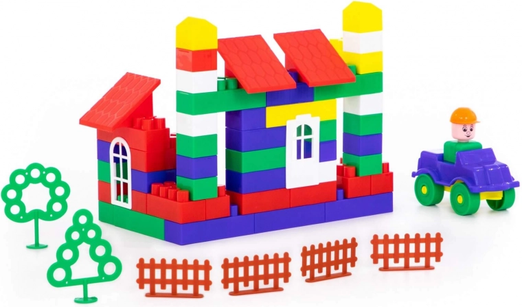 Uključuje različite oblike poput kuća, stabala i ograda koje djeca mogu slagati prema vlastitoj mašti.
