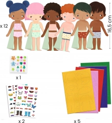 Kreativni set za odijevanje figurica od Djeco potiče dječju maštu i finu motoriku. Pomoću samoljepljivog filca i ukrasa, djeca od 3 do 6 godina mogu stvarati vlastite varijacije odjeće za 12 figura.