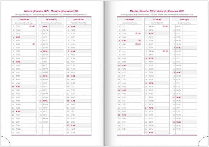Ovaj ekskluzivni rokovnik nudi širok raspon jezika uključujući hrvatski, slovački, engleski, njemački, mađarski i ruski, što omogućuje upotrebu za širok spektar korisnika. Aprint 2026 uključuje: