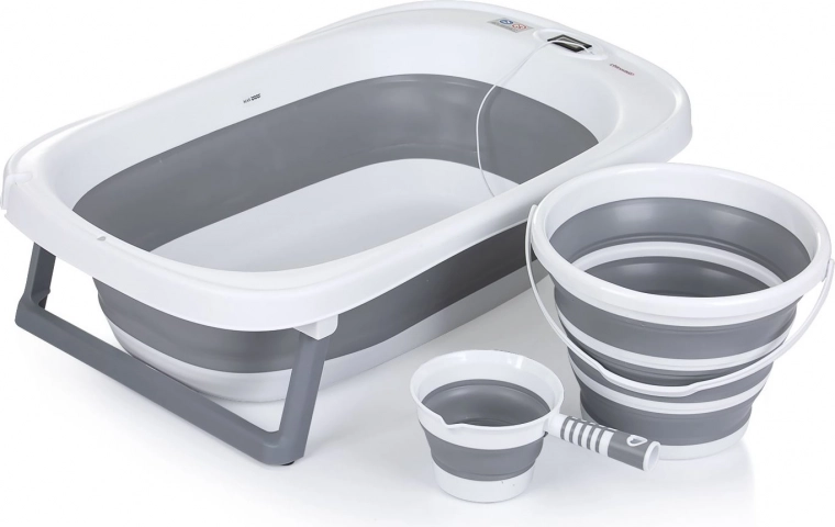 Uz kadicu dolaze sklopiva kantica i čašica za ispiranje, što olakšava upotrebu. Opremljena je sigurnosnim značajkama, kao što su termometar i protuklizne nožice, koje osiguravaju stabilnost i sigurnost za vaše dijete. Za jednostavno ispuštanje vode kadica ima čep, što uklanja potrebu za podizanjem kadice pri pražnjenju.