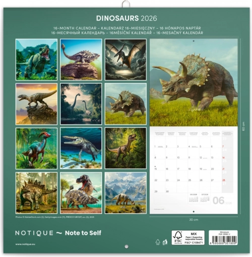 Zapisnički kalendar Dinosauri 2026 nudi zadivljujuće ilustracije prapovijesnih dinosaura dopunjene praktičnim šesterojezičnim kalendarijem koji olakšava vaše svakodnevno planiranje i bilješke.