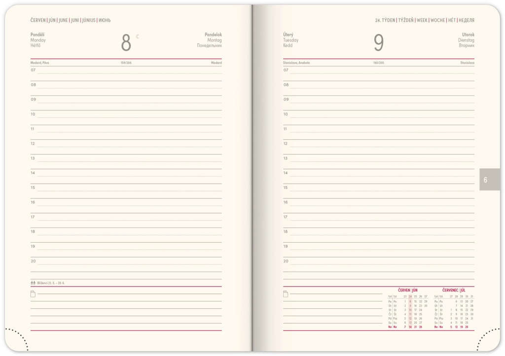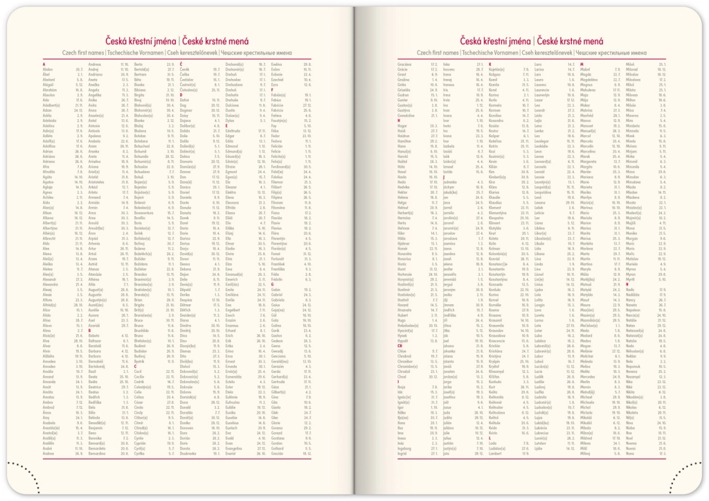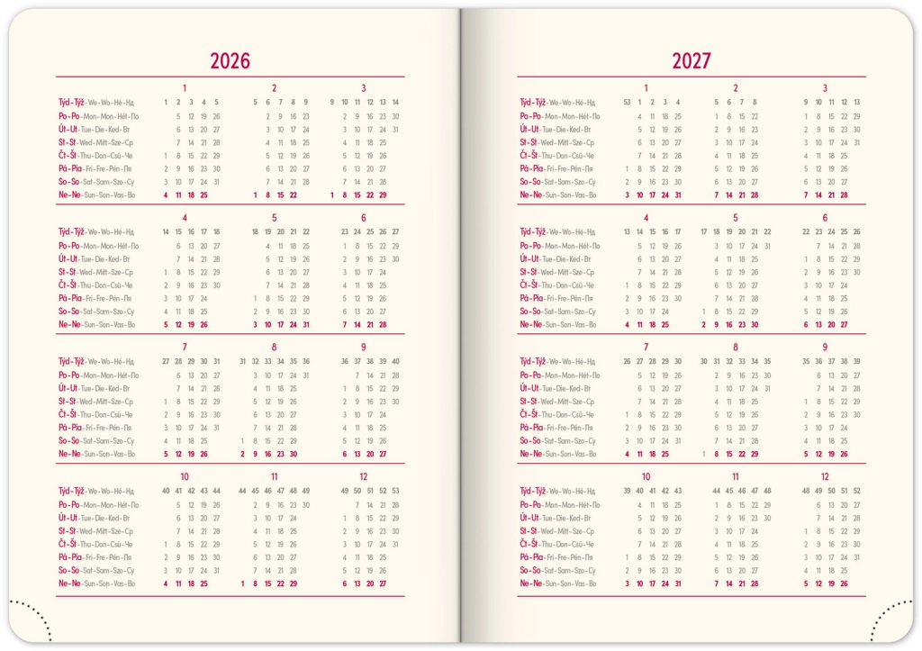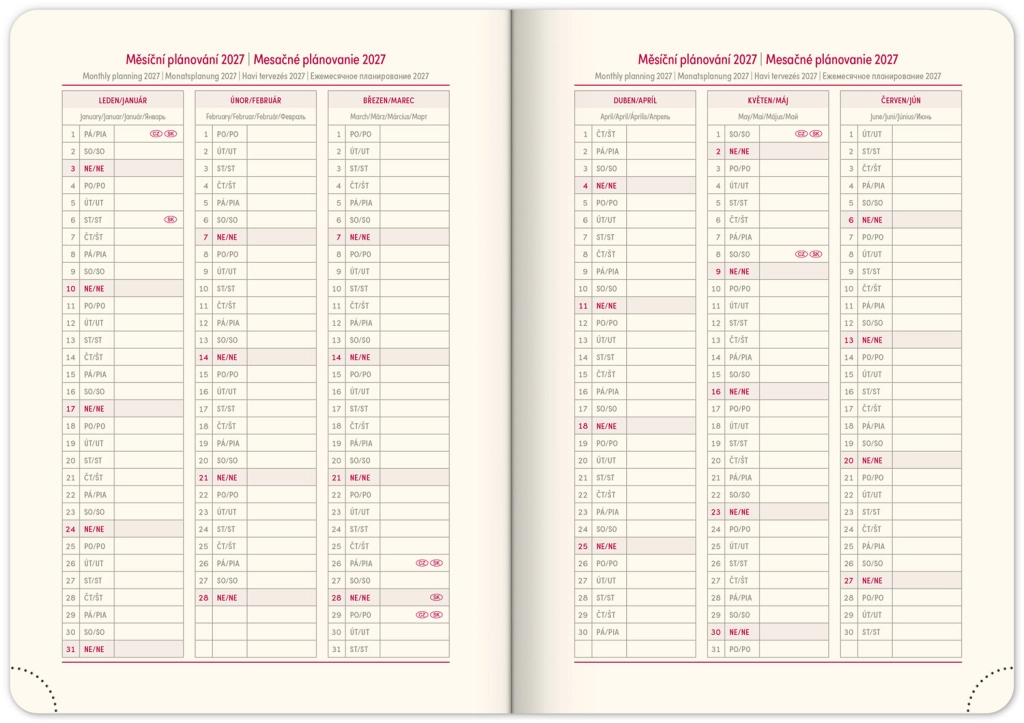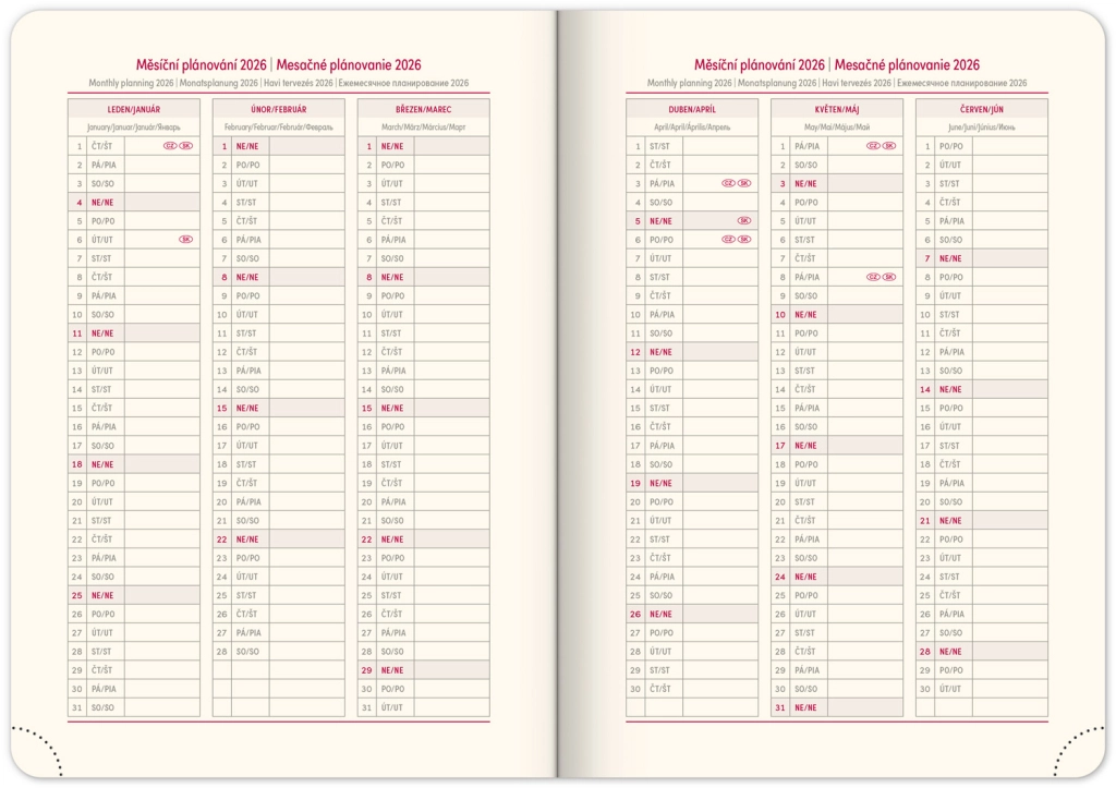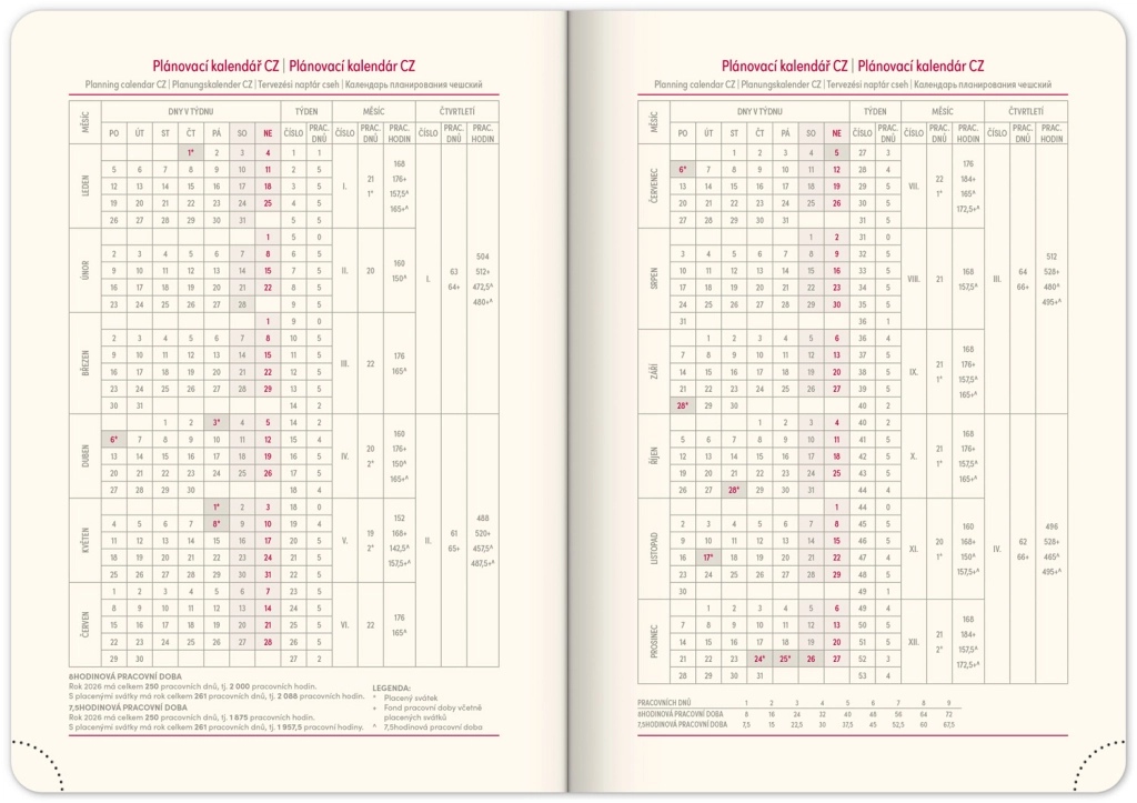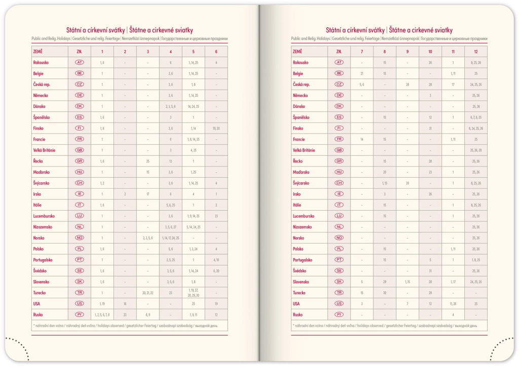 - Dnevni raspored s češko-slovačkim kalendarom i dodatnim jezicima poput engleskog, njemačkog, mađarskog i ruskog