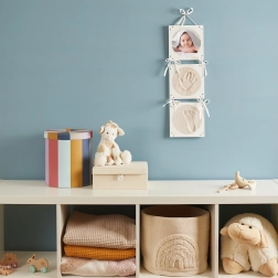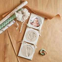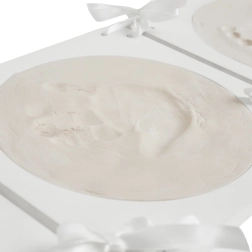 Zabilježite čarobne trenutke s ovim setom za otiske bebinih ručica i nožica. Set nudi elegantne okrugle okvire s tri prozorčića. Sadrži prostor za dva otiska i jednu fotografiju vaše bebe.