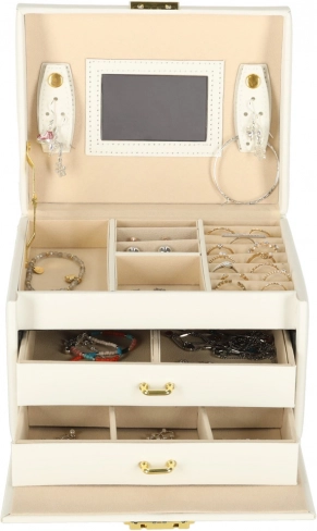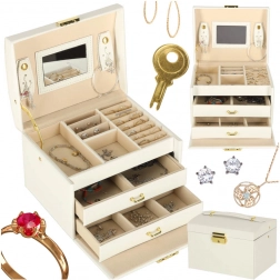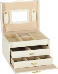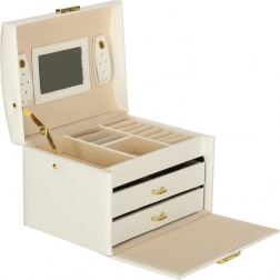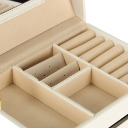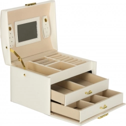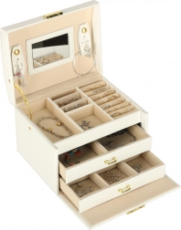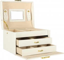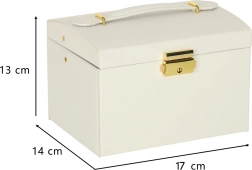 Izdržljiva izrada, bijelo izvedenje sa zlatnim detaljima i mogućnost zaključavanja ključem osiguravaju sigurno pohranjivanje vaših dragocjenosti kod kuće i na putu. Kutija je lagana, kompaktna, a istovremeno dovoljno kapaciteta za veću kolekciju.