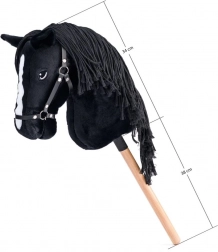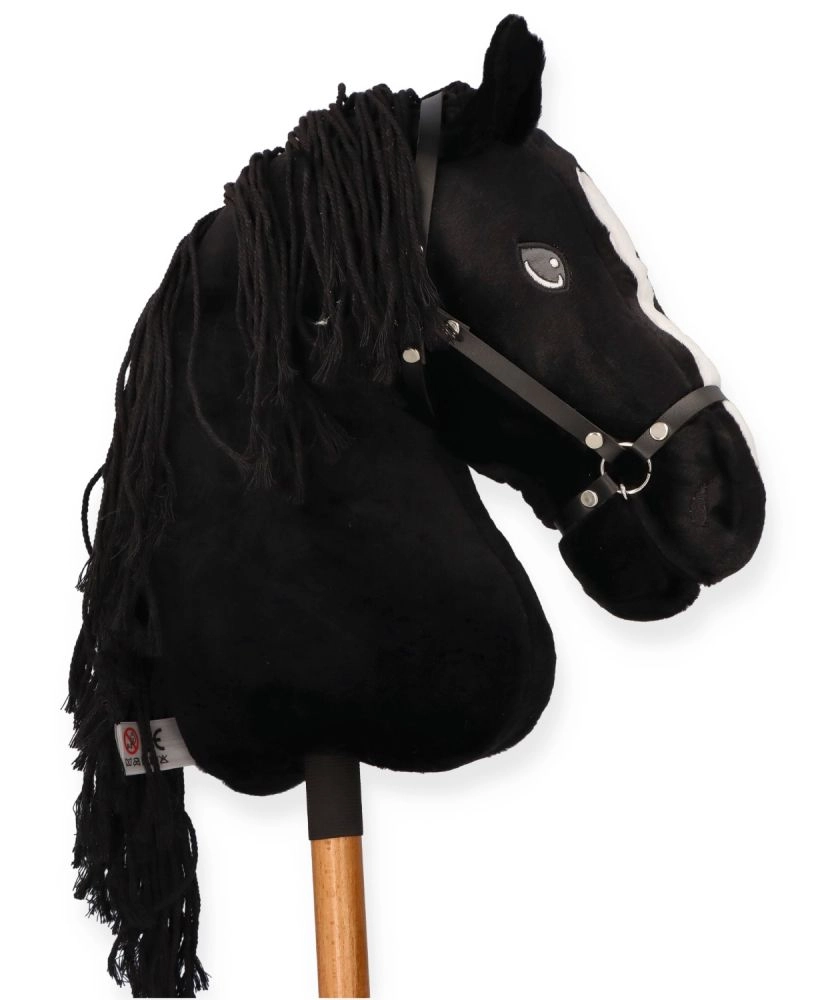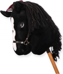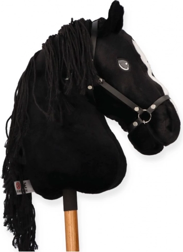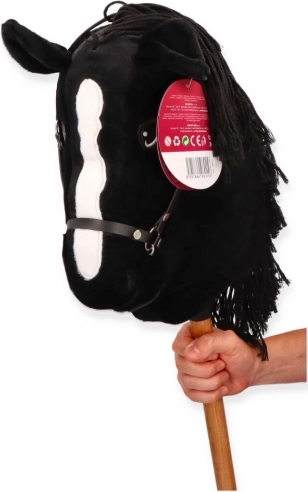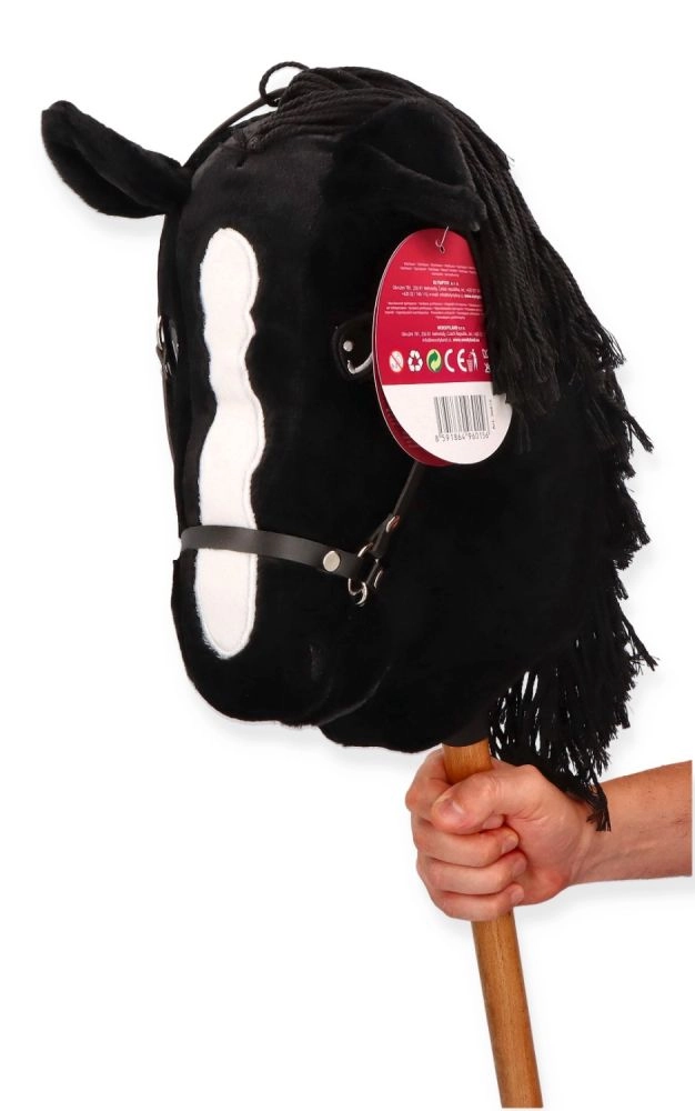 Crna plišana glava s grivom, bijelom zvijezdom i dekorativnom uzdom daje konjiću autentičan izgled koji djecu odmah uvlači u igru.
