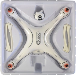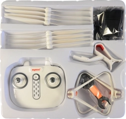 Paket sadrži: dron, daljinski upravljač, upute, odvijač, čitač kartica, propelere, kameru, držač za mobilni telefon, zaštitni okvir, punjač i ključ.