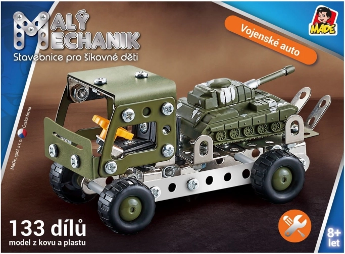 Set za slaganje Mali mehaničar vojni auto razvija vještine i pruža zabavu za djecu od 8 godina. Sadrži 133 dijela, uključujući metalne i plastične komponente.