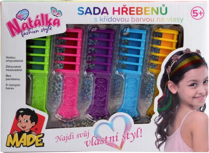 Otkrijte svijet šarenih frizura s ovim sjajnim setom češljeva. Svaki od pet češljeva nudi drugu boju, što omogućuje stvaranje fantastičnih i jedinstvenih stilova. Boje su u potpunosti sigurne za djecu od pet godina, a zahvaljujući ispirljivosti korištenje je vrlo jednostavno. Ne sadrže parabene, pa možete biti mirni što se tiče zdravlja svoje djece.