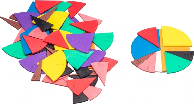 Ovaj set od 71 dijela idealan je za nastavu i pomaže djeci shvatiti osnove operacija s razlomcima. Svaki je dio označen odgovarajućim razlomkom: