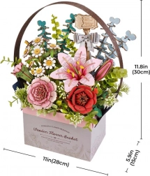 RoboTime 3D drvena slagalica Cvjetna Košarica donosi jedinstveno iskustvo stvaranja. Cvjetovi poput ružičastog ljiljana, crvene ruže ili ružičastog karanfila simboliziraju divljenje, strast i zahvalnost. 3D modeliranje potiče razvoj fine motorike, logičkog razmišljanja i strpljenja. Sjajna dekoracija ili poklon za kreativce. Slagalica sadrži 428 dijelova precizno izrezanih laserom, koji se lako uklapaju jedni u druge, čime nastaje stabilan i izdržljiv model. Košarica ima otvore za jednostavno postavljanje cvijeća prema vašoj mašti.