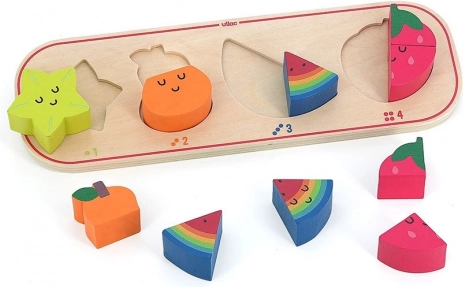 Umetajuća slagalica Učim brojiti Voće je drvena igra za djecu koja ih upoznaje s brojevima od 1 do 4 i razvija njihove motoričke vještine uz pomoć šarenih dijelova voća.