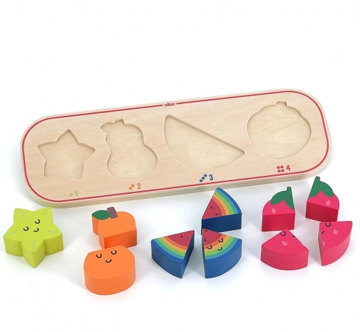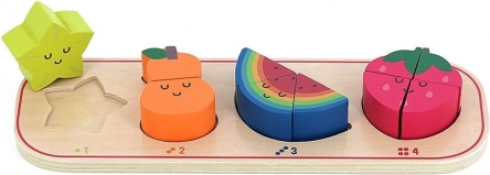 Ova zabavna i edukativna slagalica donosi djeci radost otkrivanja i učenja kroz igru. Svaki dio voća, kao što su žuta karambola, narančasta kruška, šareni lubenica i crvena jagoda, dolazi u različitom broju dijelova za umetanje u drvenu podlogu. Djeca uče prepoznavati oblike, boje i odgovarajuće brojeve, što prirodno razvija njihovu finu motoriku i koordinaciju ruka-oko.