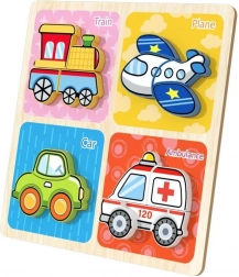 Drvene puzzle dimenzija 30 x 30 cm sadrže slike četiri različita prometna sredstva, što igri daje na atraktivnosti i obrazovnoj vrijednosti. Djeca se s ovim puzzlama ne samo igraju, već i vježbaju finu motoriku i logičko razmišljanje, što je idealno za djecu od 3 godine naviše.