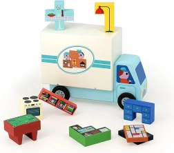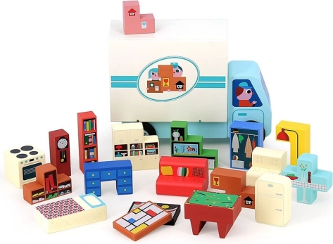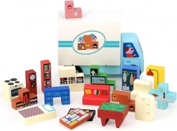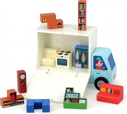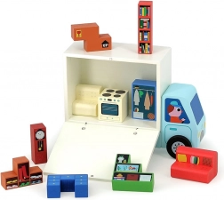 Set sadrži drveni selidbeni kamion i 19 komada kocaka namještaja, idealno za samostalnu ili zajedničku igru s obitelji.