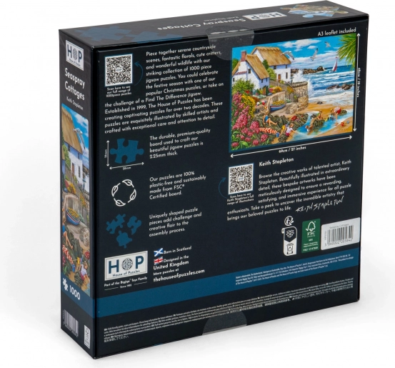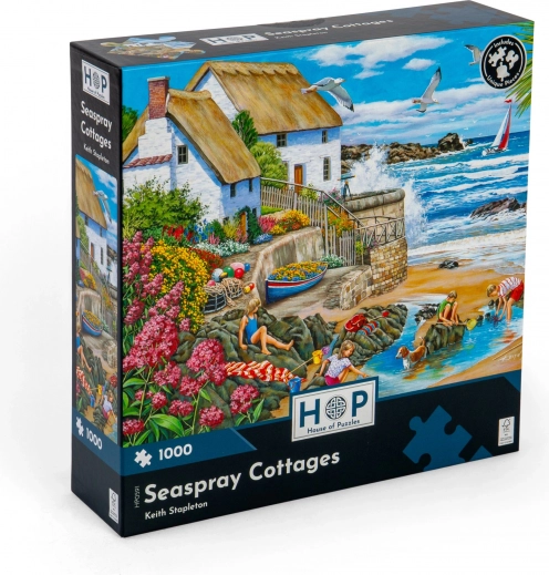 Jedinstvene puzzle Kućica na obali s 1000 dijelova, nepravilni oblici za veću zabavu; pakiranje sadrži plakat.