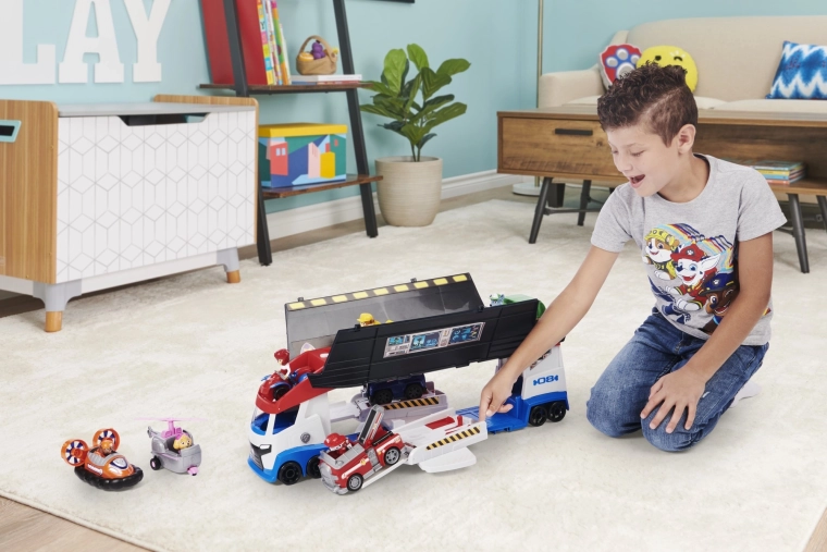 Ogromni transporter inspiriran omiljenom serijom PAW PATROL razveselit će sve male spasioce. Zahvaljujući preklopnim bočnim panelima i rampama, iz karoserije kamiona nastaje mobilni servis i zapovjedništvo. Pritiskom na gumb s otiskom šape oglašavaju se realistični zvukovi motora, trube i vožnje unatrag, koji još više pojačavaju atmosferu igre.