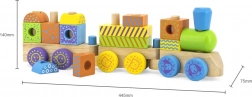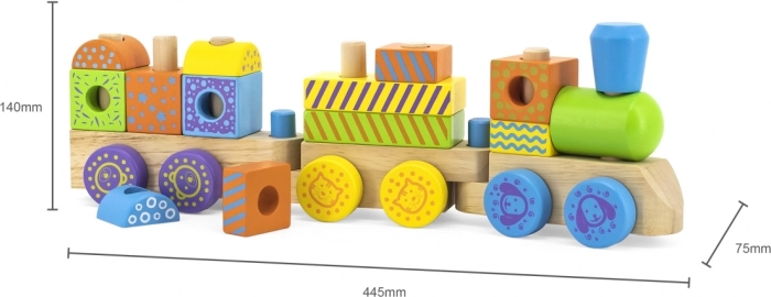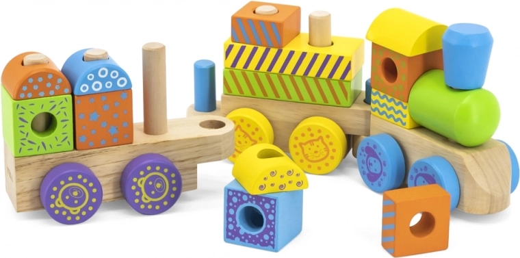 Ovaj kvalitetni drveni vlakić sastoji se od nekoliko vagona s klipićima na koje djeca slažu raznobojne geometrijske kocke. Kombinira slaganje, povlačenje i građenje, pa potiče maštu i vježba koordinaciju oko–ruka. Pažljivo obrađeno drvo i netoksične boje osiguravaju sigurnost i izdržljivost pri svakodnevnoj igri.