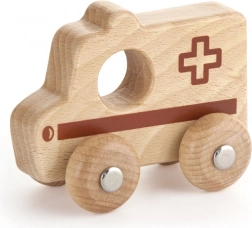 Ovo drveno vozilo hitne pomoći kvalitetna je igračka namijenjena za svakodnevnu igru. Izdržljiva izrada, glatki rubovi i slobodan hod kotača omogućuju glatku vožnju po raznim podlogama te prirodno potiču finu motoriku, koordinaciju oko–ruka i maštu.