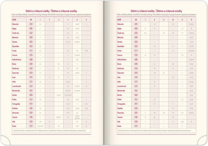 Ovaj dnevnik savršen je izbor za one koji traže kombinaciju stila i funkcionalnosti. Opremljen je zaobljenim kutovima, držačem za olovku i elastičnom gumicom za sigurnije zatvaranje. Dnevnik ima tjedni raspored i sadrži češko‑slovački kalendarij zajedno s dodatnim jezicima kao što su engleski, njemački, mađarski i ruski.