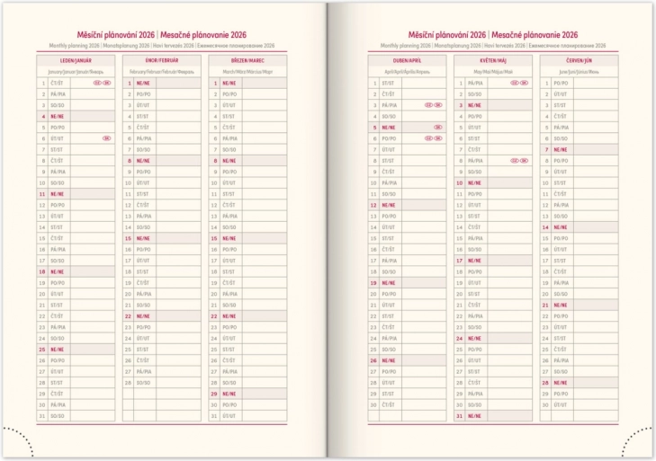 - Tjedni raspored s češko-slovenskim kalendarom i dodatnim jezicima: engleski, njemački, mađarski i ruski.
