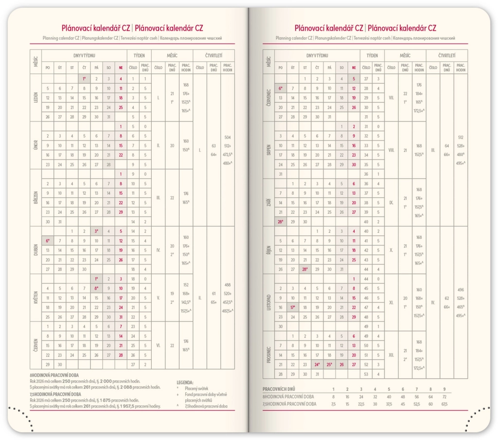 Planer Rivoli 2026 oduševit će vas svojim modernim dizajnom, upotpunjenim praktičnim elementima poput čvrste gumice i držala za olovku. Savršen za svakodnevnu uporabu zahvaljujući svom tjednom rasporedu, koji uključuje češko-slovački kalendarij s dodatnim jezicima – engleskim, njemačkim, mađarskim i ruskim.