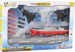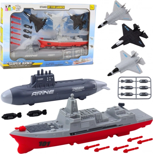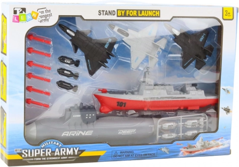 Ovaj jedinstveni vojni set pruža djeci priliku da dožive zabavne bitke na moru i u zraku. Izrađen od kvalitetne plastike, oponaša vojna vozila u jednostavnijem dječjem obliku. Zahvaljujući mjestima za montažu raketa i torpeda, djeca se mogu radovati još više igračkoj akciji.