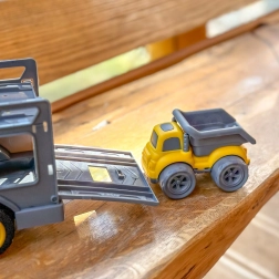 Veliki nosač s rampama omogućuje lako ukrcavanje i prijevoz sva tri vozila. Stabilna konstrukcija podnosi i intenzivnu dječju igru.